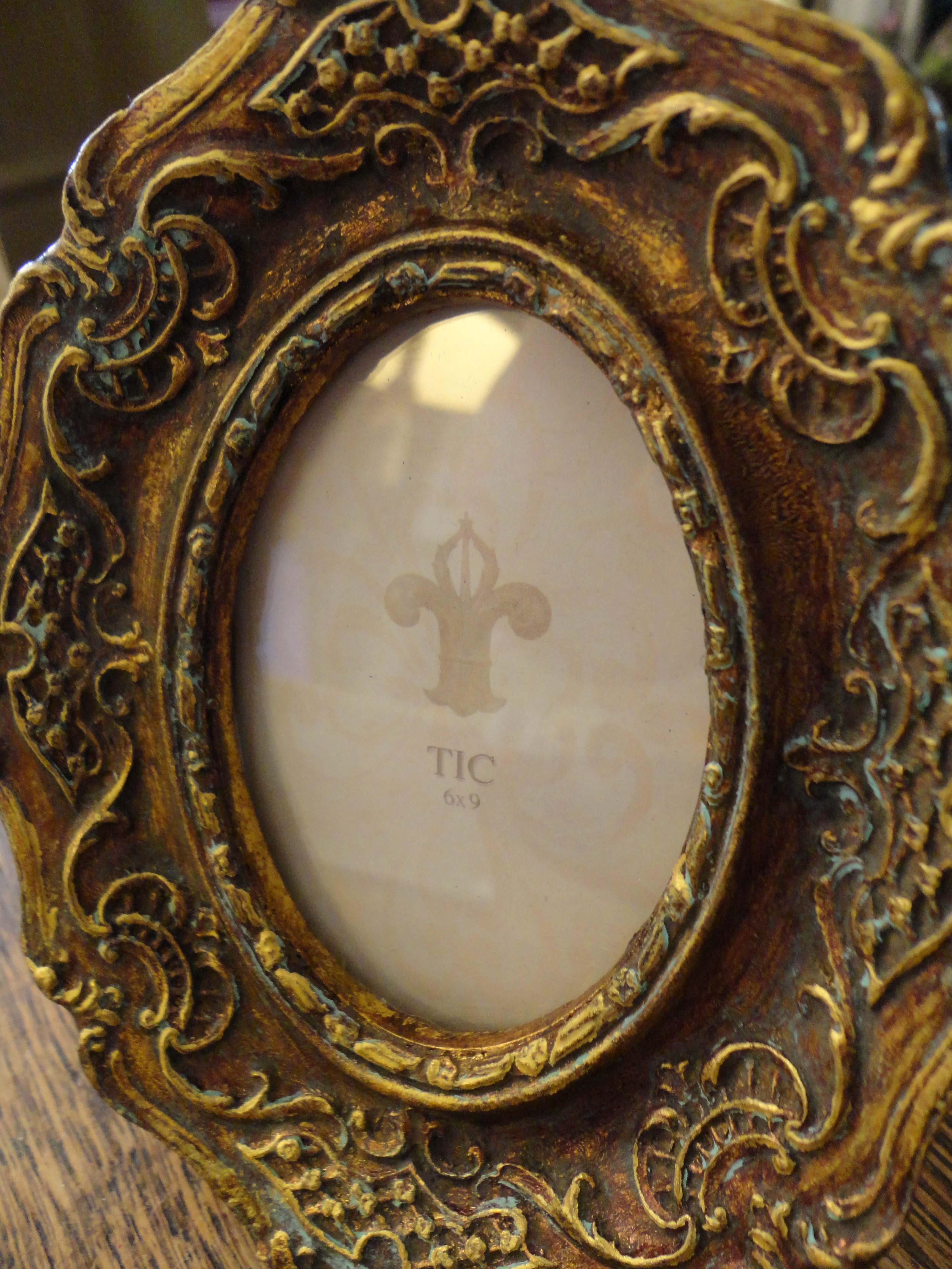 This cute frame was pretty before I started but now I like it even better. It had an all over copper look and now it has touches of green moire and the gold lame that I finger-painted on which gave the original finish a lot more depth.