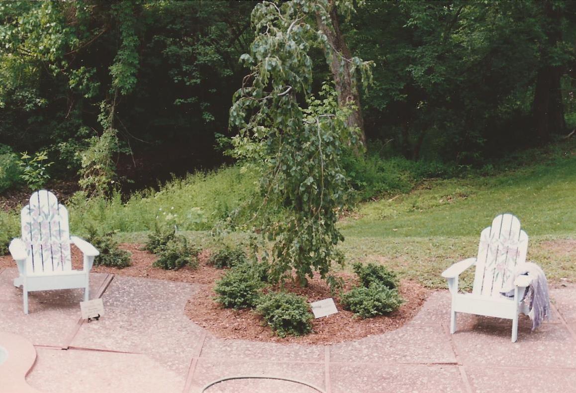 Below is a shot taken at a Showhouse that we were invited to participate in – early 90’s. We painted Adirondack chairs for the pool area which was surrounded by a beautiful garden of rhododedrons…the chairs were painted a light blue to reflect the blue of the pool and had beautiful purple rhododendrons painted across the backs. It was a pretty effect!