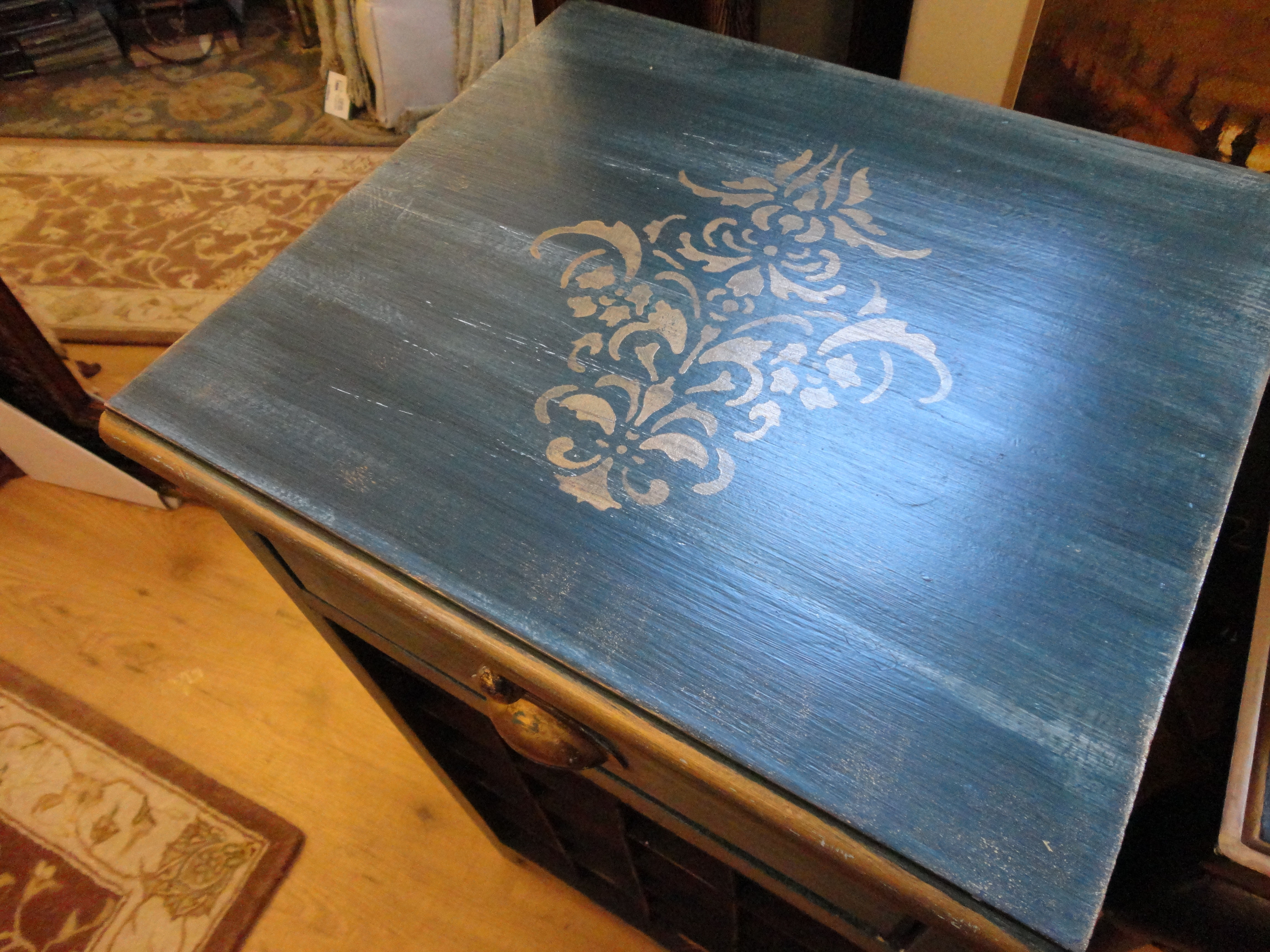 Currently I am painting in a customer’s home hard at work making a very contemporary piece look as uncontemporary as possible…It’s a challenge but I think it will be very pretty when complete. My other project is a piece that the customer dropped off at the shop for painting. Curiously enough both pieces are being painted black with gold accents! The piece in the shop is a drop leaf table and I am going to stencil a beautiful gold design on top! Cant wait for that part.