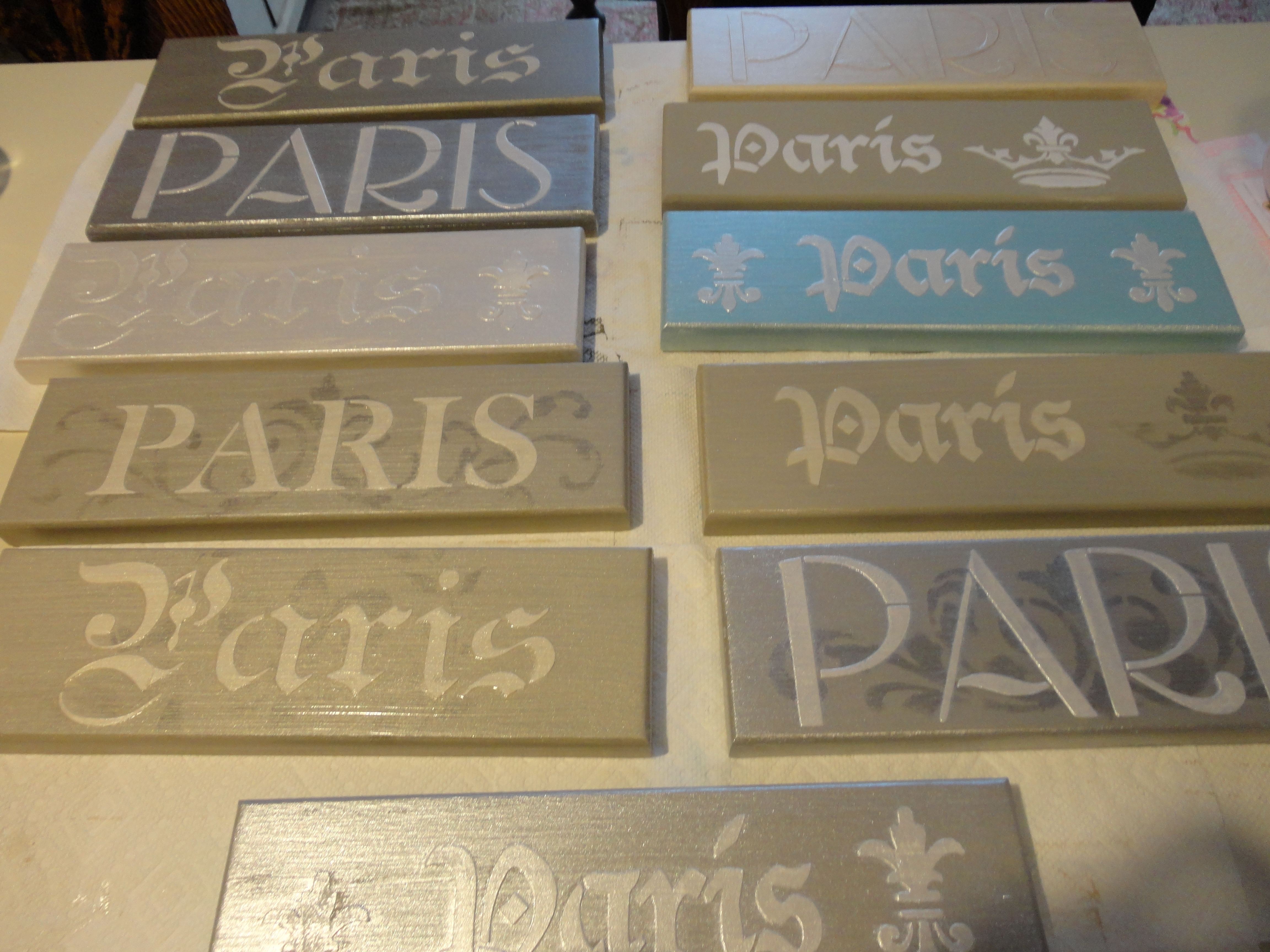 So previously I had painted two coats of Paint Couture on my signs…then I stenciled a background design on some of them and distressed it so it was faint. I used Paint Couture’s Embossing medium over top and stenciled on different Paris configurations.