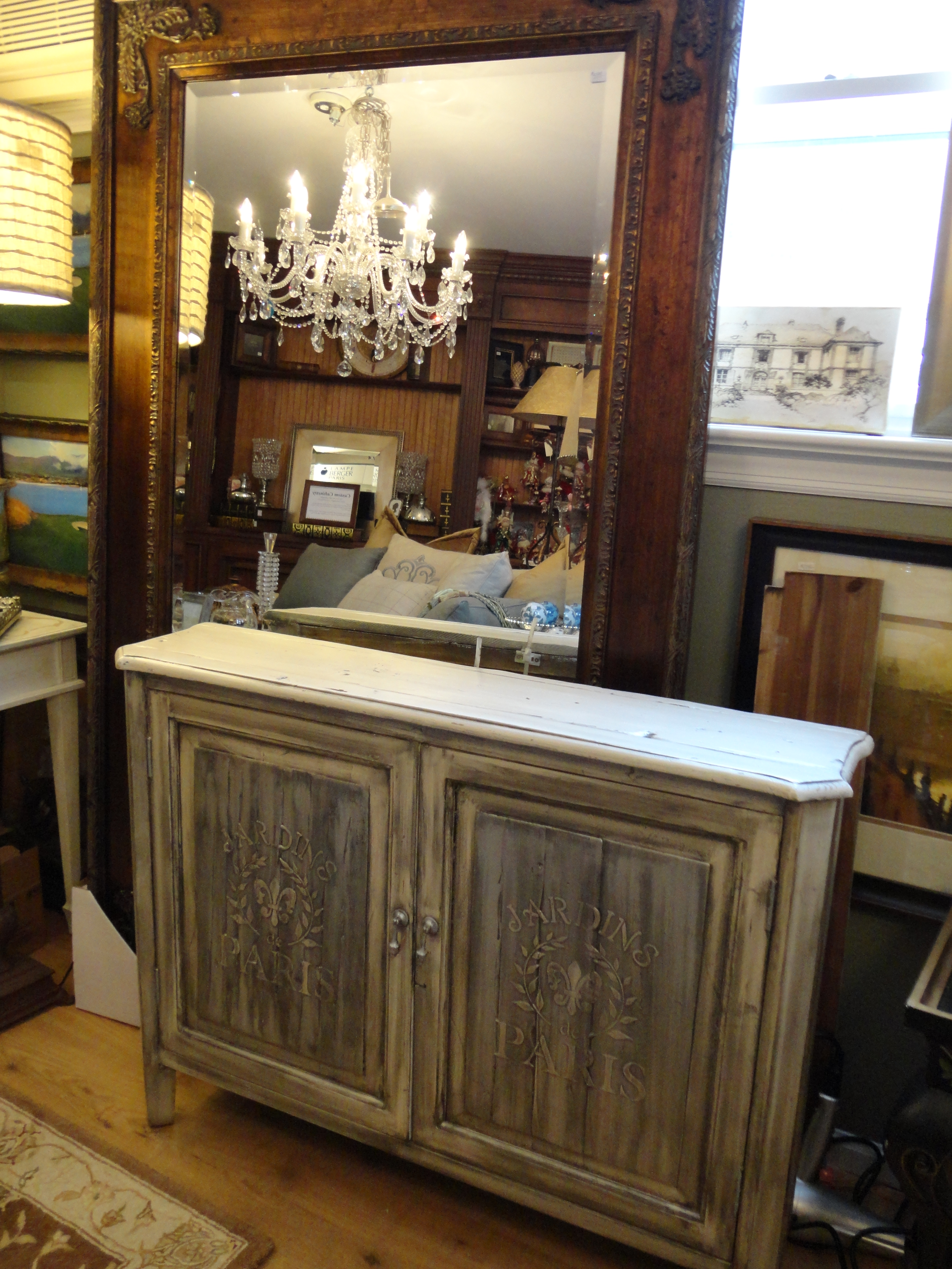 Several new mirrors have arrived at The Whistling Elk – The mirror pictured is one of my favorites and I set it up behind a little cabinet I was planning on painting. Sitting at my desk I can look out and appreciate the mirror – the chandelier reflected in it and now the little cabinet that I just finished painting. Love this little vignette!